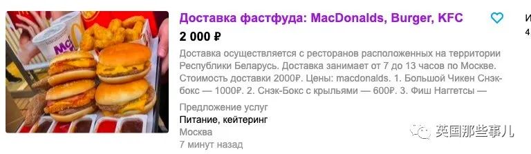 卖家表示,他可以去白俄罗斯帮你买麦当劳,送到莫斯科交货需要7-13小时,运费2000卢布,约132元人民币。