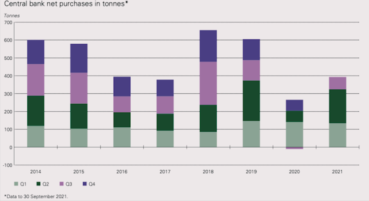 世界黄金协会调查显示,21%的全球央行将在2022年会继续购买黄金,仍将作为国际储备的关键组成部分。数据显示,2021年全球央行大幅购买463吨黄金,增长82%,比最近五年的平均水平高出39%,截止1月的5年内,全球央行的购买量高达2285吨,创下美元与黄金脱钩那年以来的最快购买速度纪录。