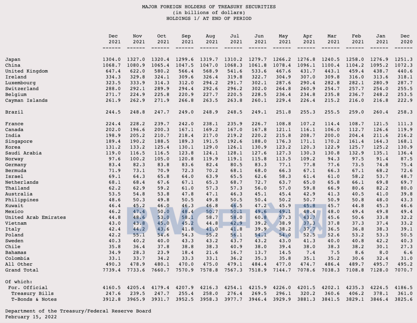 据美国财政部在2月16日最新发布的国际资本流动报告显示,2021年12月,包括中国和日本等在内的至少有20大美债持有者大幅抛售了480亿美元的美债,且为去年5月以来最大规模的美债资金外流(具体数据细节请参考下图),同时,这股抛售美债的趋势到此并没有结束。