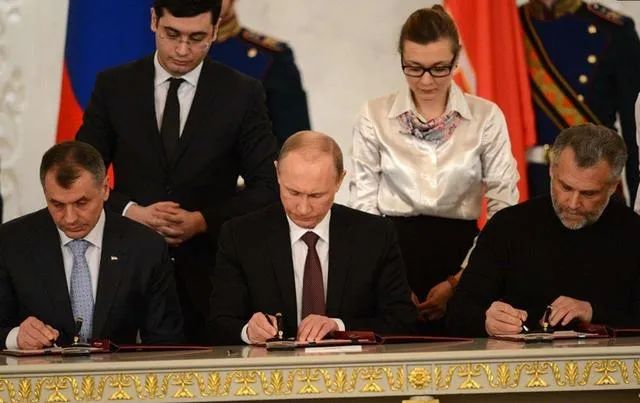 普京与克里米亚、塞瓦斯托波尔市领导人签署了克里米亚成为俄罗斯一部分的条约