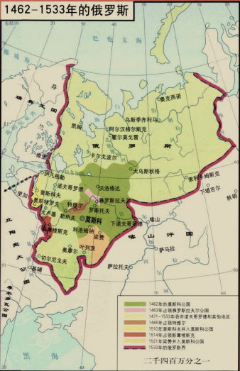 公元1505年,伊凡三世去世后,瓦西里三世掌权(1505—1533年在位),他带领莫斯科继续扩张地盘与权力。1510年莫斯科公国征服了普斯科夫,1511年又兼并了梁赞公国,最后终于结束东北罗斯长期分裂割据的局面,建立了统一的俄罗斯国家。