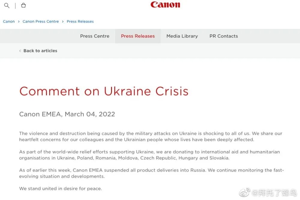 佳能:向乌克兰、波兰、罗马尼亚、摩尔多瓦、捷克、匈牙利、斯洛伐克进行人道主义援助,并停止对俄一切出货。
