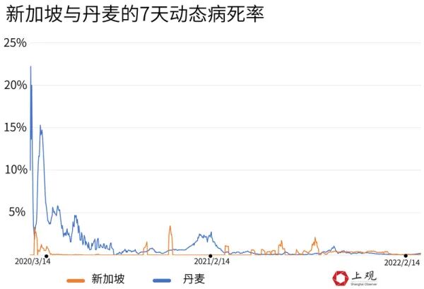 从7天动态病死率来看,BA.2毒株也没有导致死亡人数的增加。BA.2毒株已成为丹麦与菲律宾的主要毒株,但两国的动态病死率依旧保持在一个较低的状态,2022年3月13日,丹麦的动态病死率为0.22%(峰值为22.2%),而新加坡的动态病死率仅为0.057%(峰值为3.4%)。
