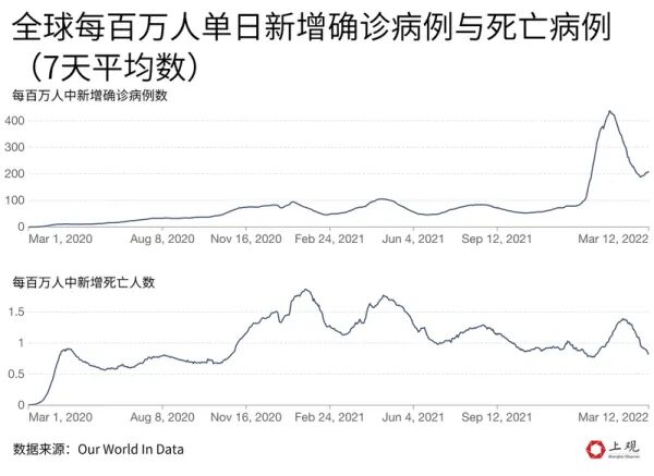 全球单日新增病例数在3月2日已降至148万人,与此前峰值(345万人)相比下降了57%;而全球单日新增死亡人数也在3月12日降至6425人,而此前峰值为10923人。