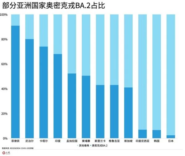 而在亚洲,菲律宾则是BA.2扩散最快的国家。在病例抽样总数为1063人中,有965人感染了BA.2毒株,占比达到91%;尼泊尔、卡塔尔、印度、孟加拉国和柬埔寨五国,其感染BA.2毒株的患者占比都超过50%;此外,BA.2也成为斯里兰卡、格鲁吉亚、新加坡、文莱等国家的主要传播毒株,占比都接近50%。