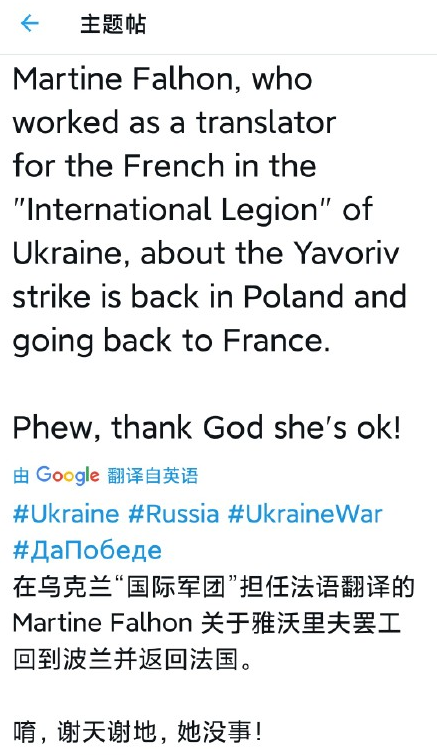先是一个自愿过来帮忙的法国女翻译,她本来希望能够在乌克兰军队中当翻译,协助法国雇佣兵和乌克兰军队作战,结果还没站稳脚跟,基地就被人给掀了,其人吓得一刻都不敢停,直接从乌克兰跑回了波兰,决定离开这个国家不再回来;